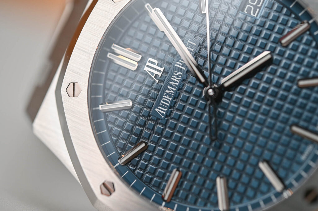 When comparing the replica side-by-side with a genuine Royal Oak, small differences become obvious. The font on the date wheel, the sharpness of the bezel screws, and the finishing on the hands and markers are usually the biggest giveaways. The lume application may also be weaker or uneven compared to the original.